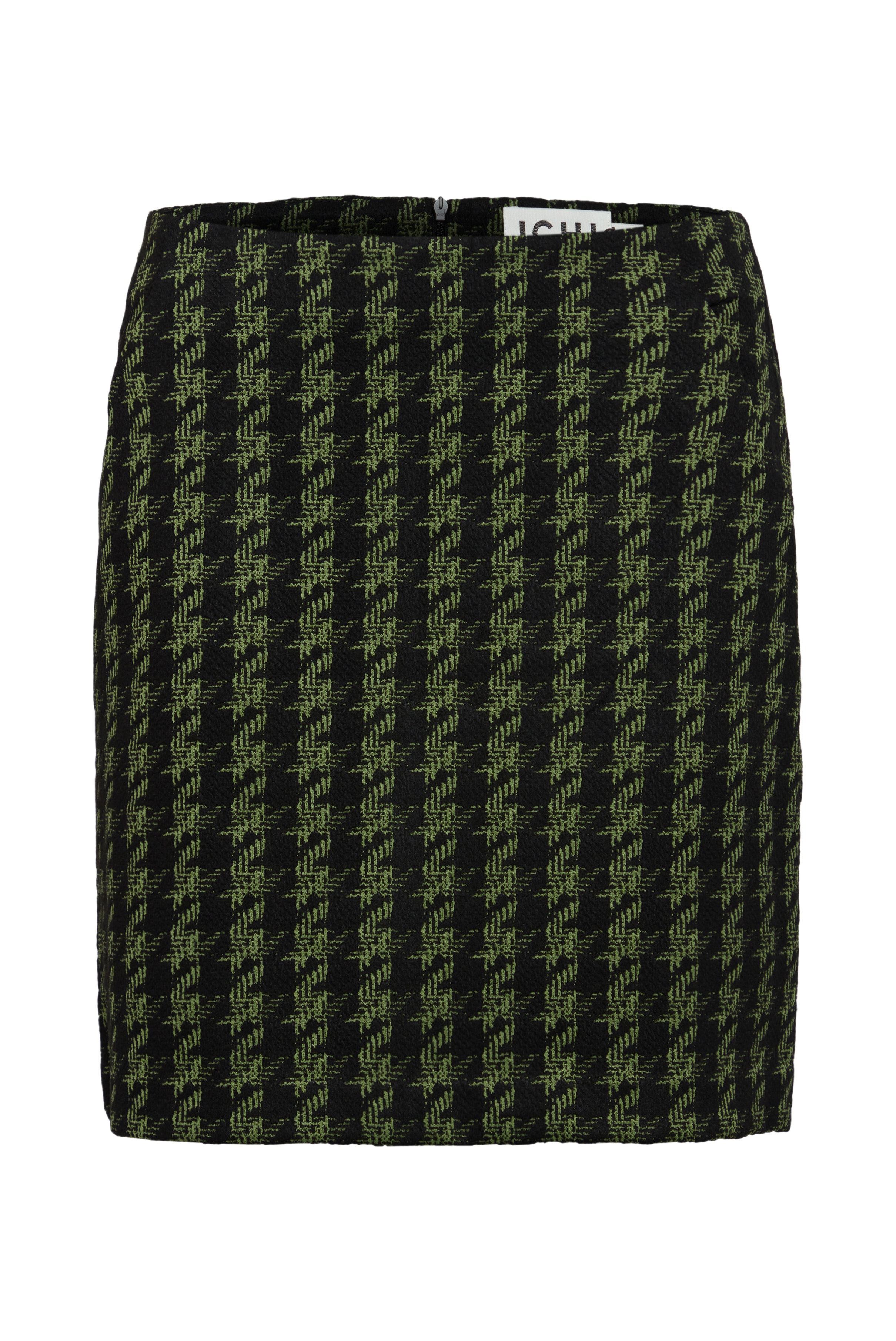 Denne mininederdel fremhæver et markant hundetandsmønster og et struktureret udtryk. Lige silhuet og kort længde giver et stilrent, skræddersyet look.