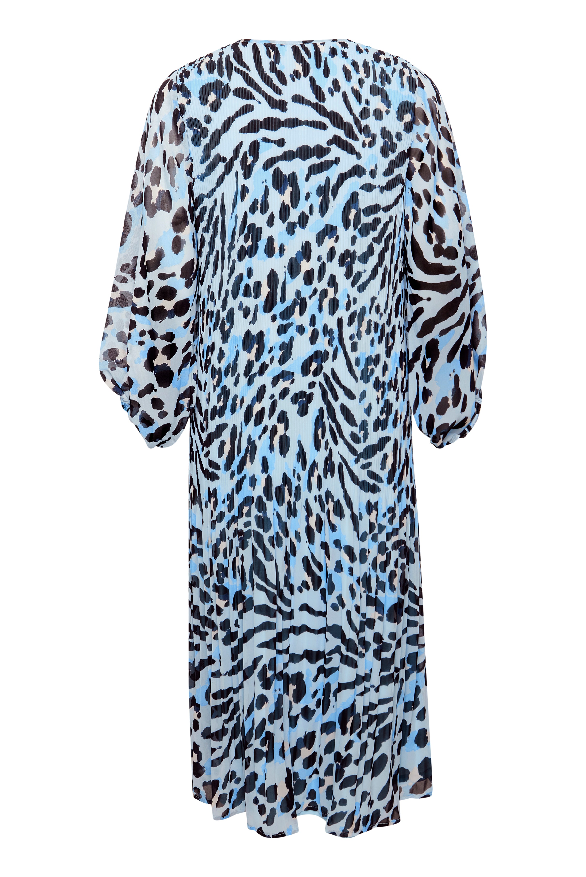 Midi-Kleid mit animalischem Muster, subtiler Plissee-Struktur und lockerer A-Linie. V-Ausschnitt und weite 3/4-Ärmel mit gerafften Abschlüssen.