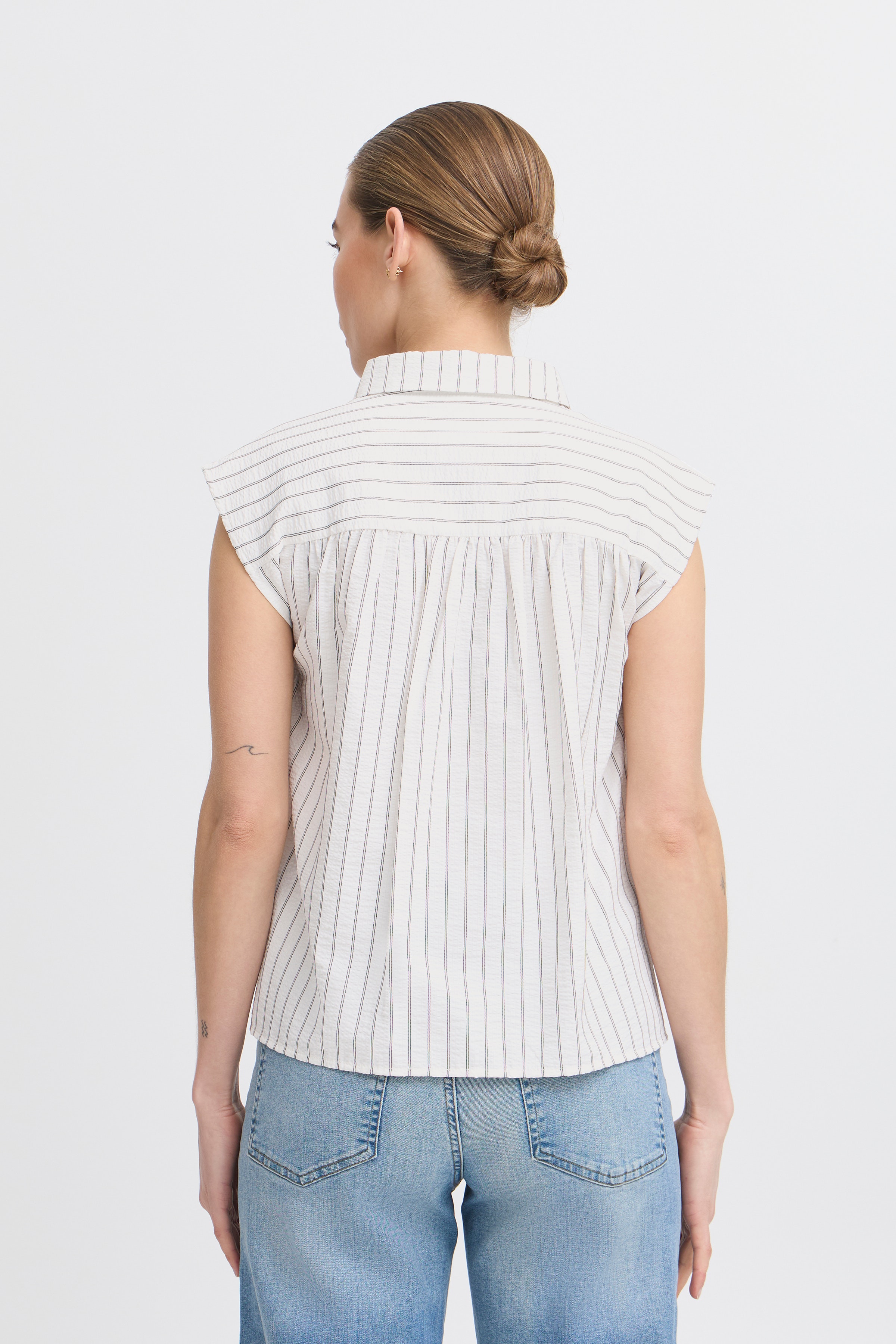 Ärmellose gestreifte Bluse mit klassischem Kragen und kompletter Knopfleiste. Gerader Schnitt, angenehme Struktur.