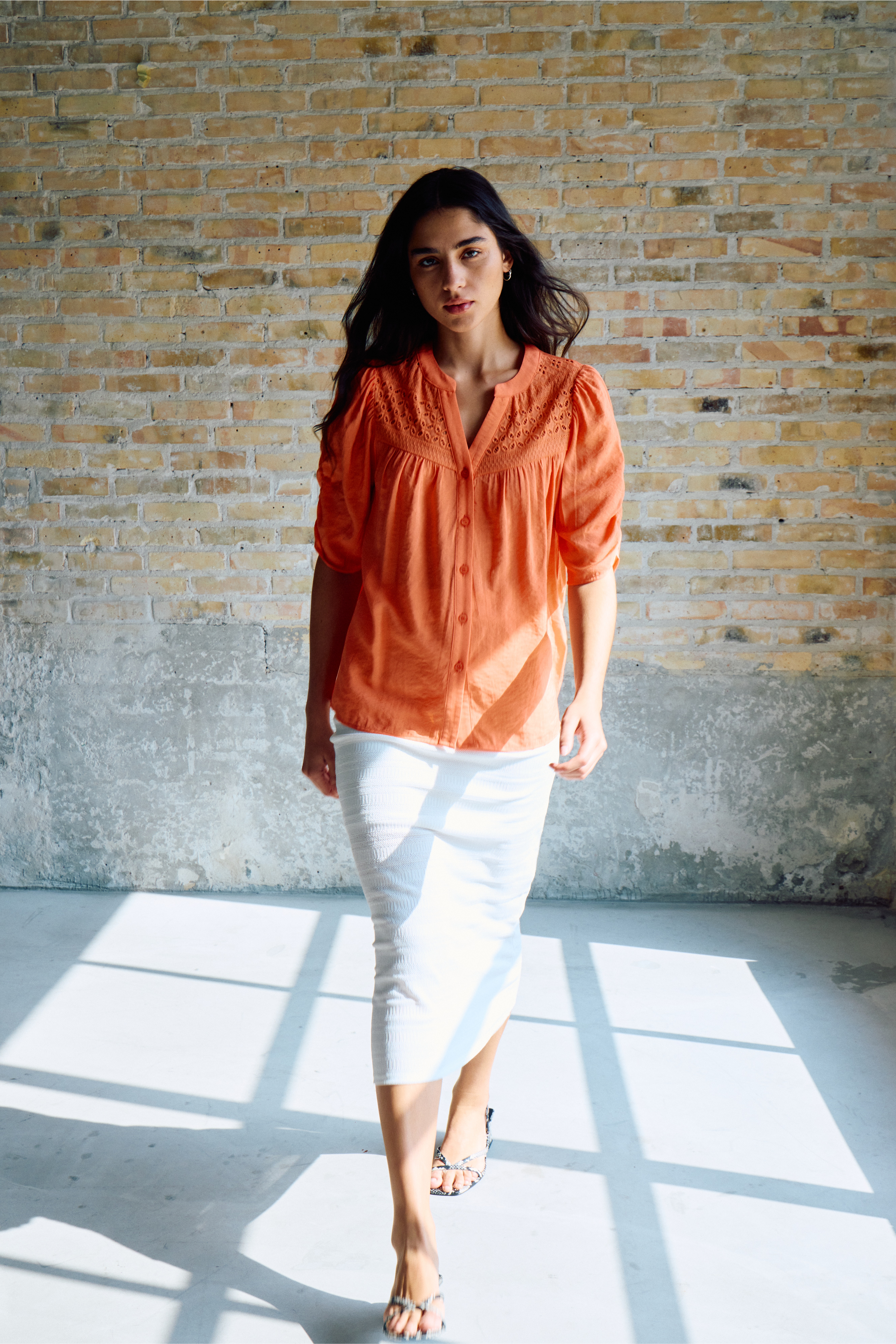 Straight-fit midi skirt features a subtle textured finish and a clean waistband. Falls below the knee for an effortless, sculptural silhouette.